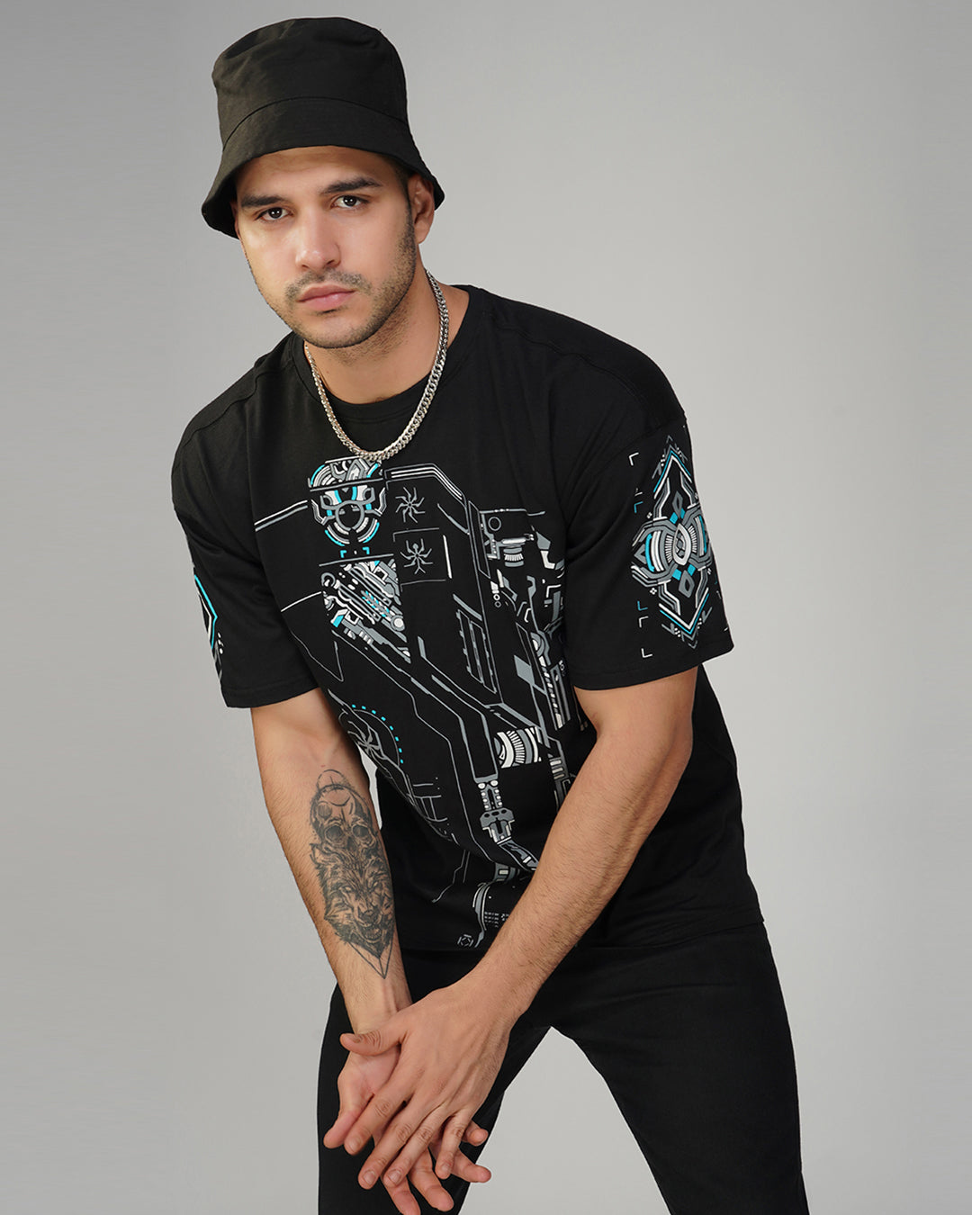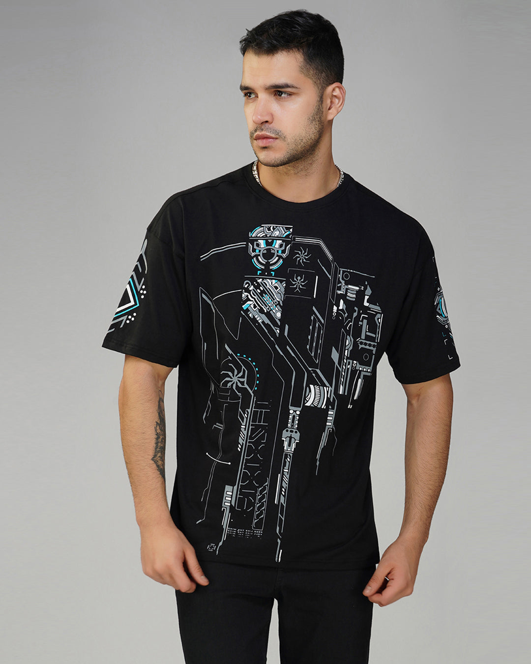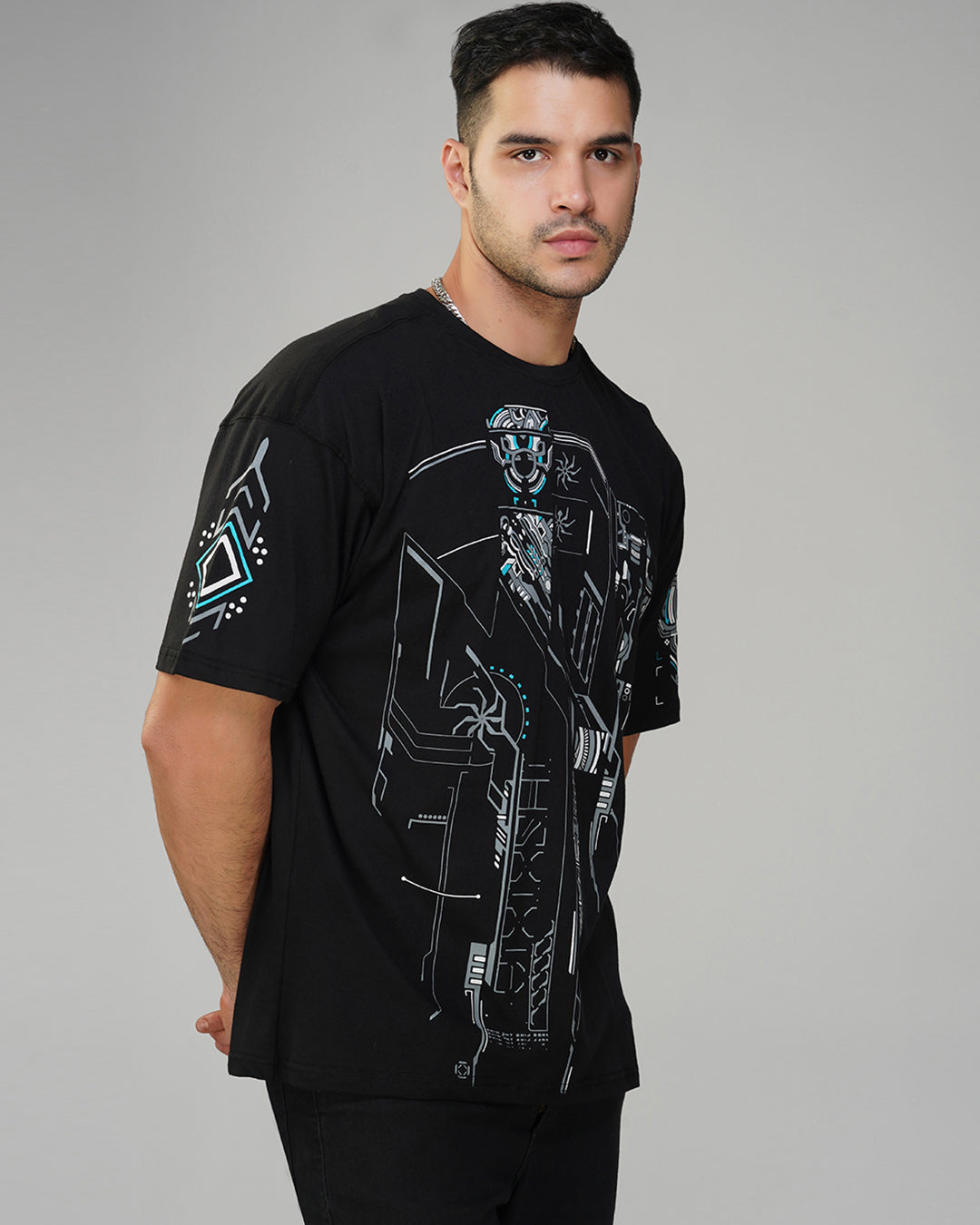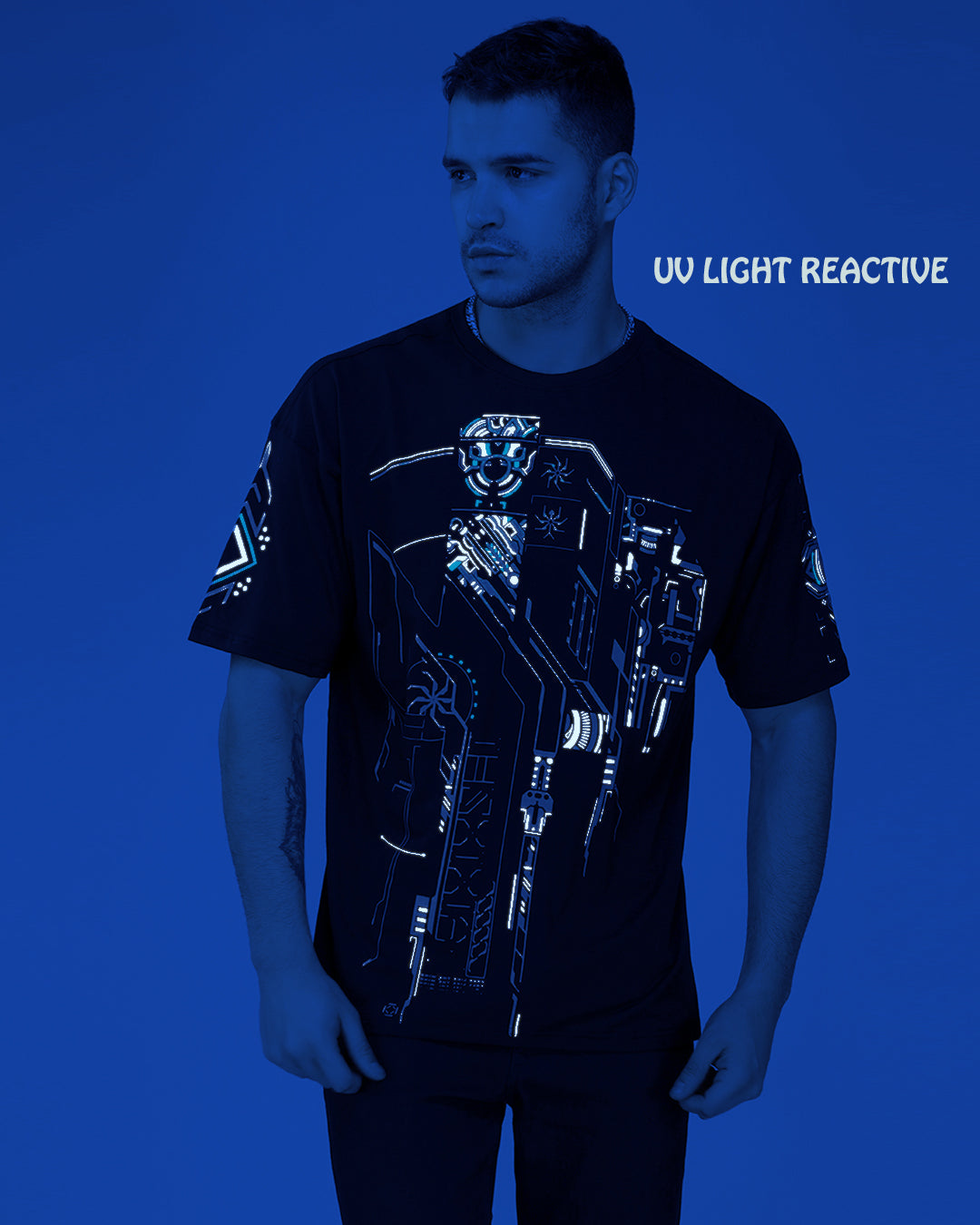 This oversized cotton t-shirt is made with 100% premium quality fabric and features a round neck, half sleeves, and a long fit. The hand-made silk screen print on the base color black is the main trend, creating a UV light reactive effect. This t-shirt is perfect for both casual and party occasions and can be easily washed in a machine with cold water. For the perfect fit, refer to our size chart.