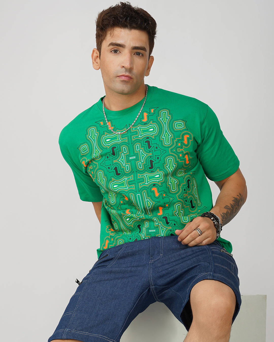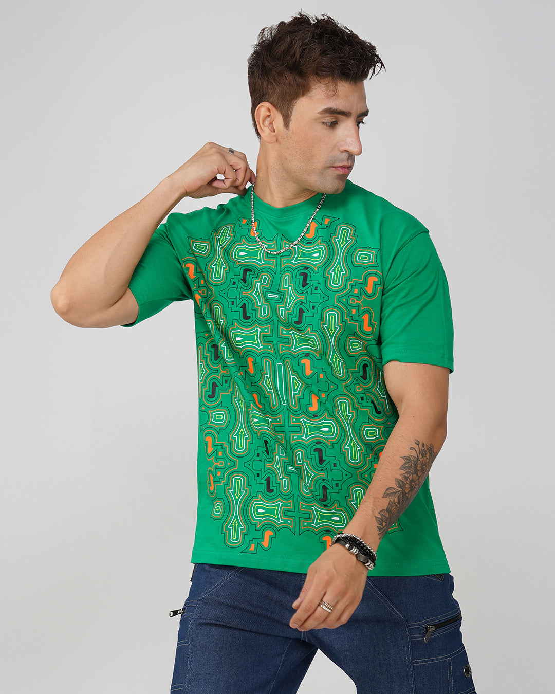 This oversized cotton t-shirt is made with 100% premium quality fabric and features a round neck, half sleeves, and a long fit. The hand-made silk screen print on the base color Sea Green is the main trend, creating a UV light reactive effect. This t-shirt is perfect for both casual and party occasions and can be easily washed in a machine with cold water. For the perfect fit, refer to our size chart.